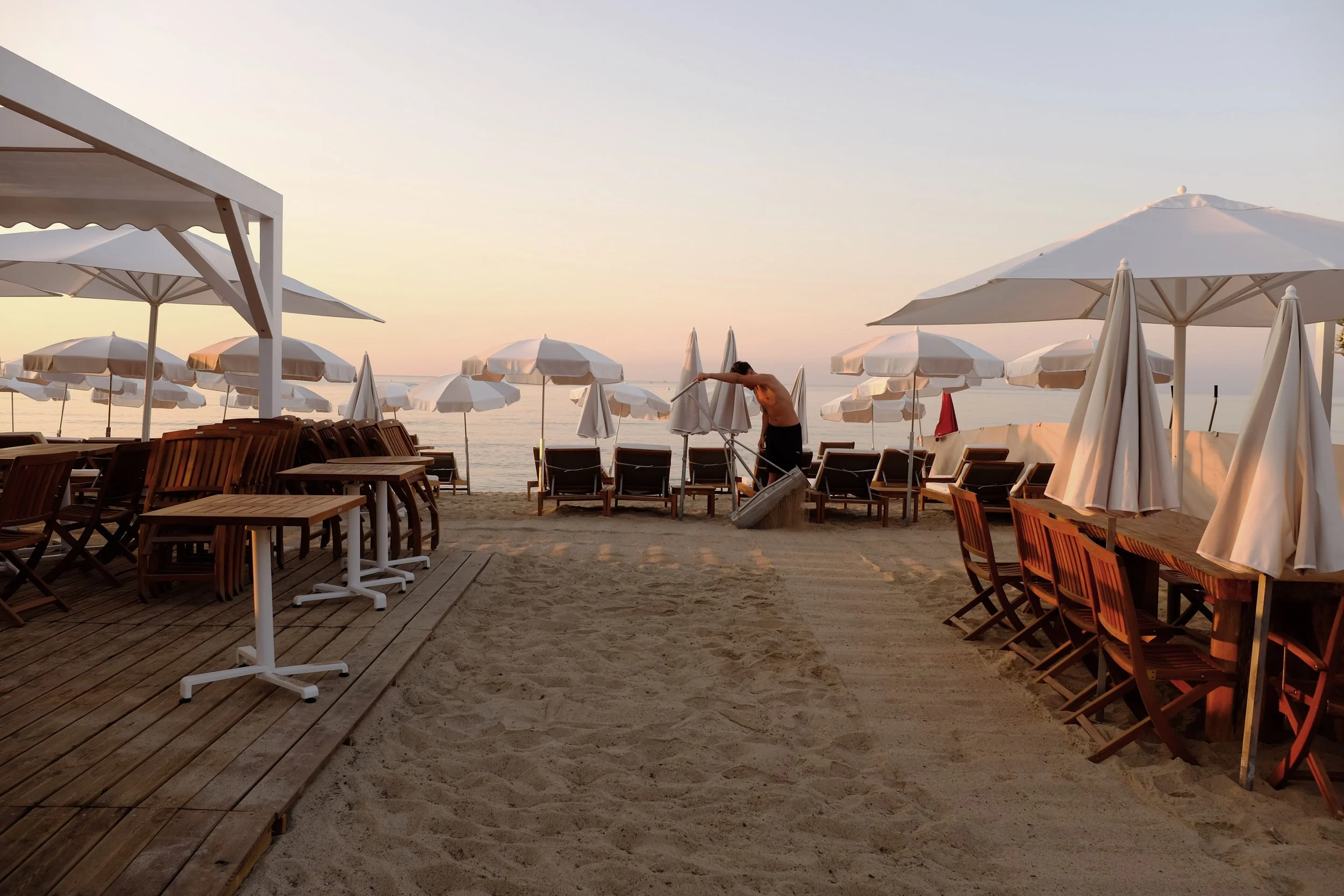 Tous les matelas blancs mis à disposition de la clientèle sont surélevés sur un sommier en bois, accompagnés de parasols individuels et d’une petite table.